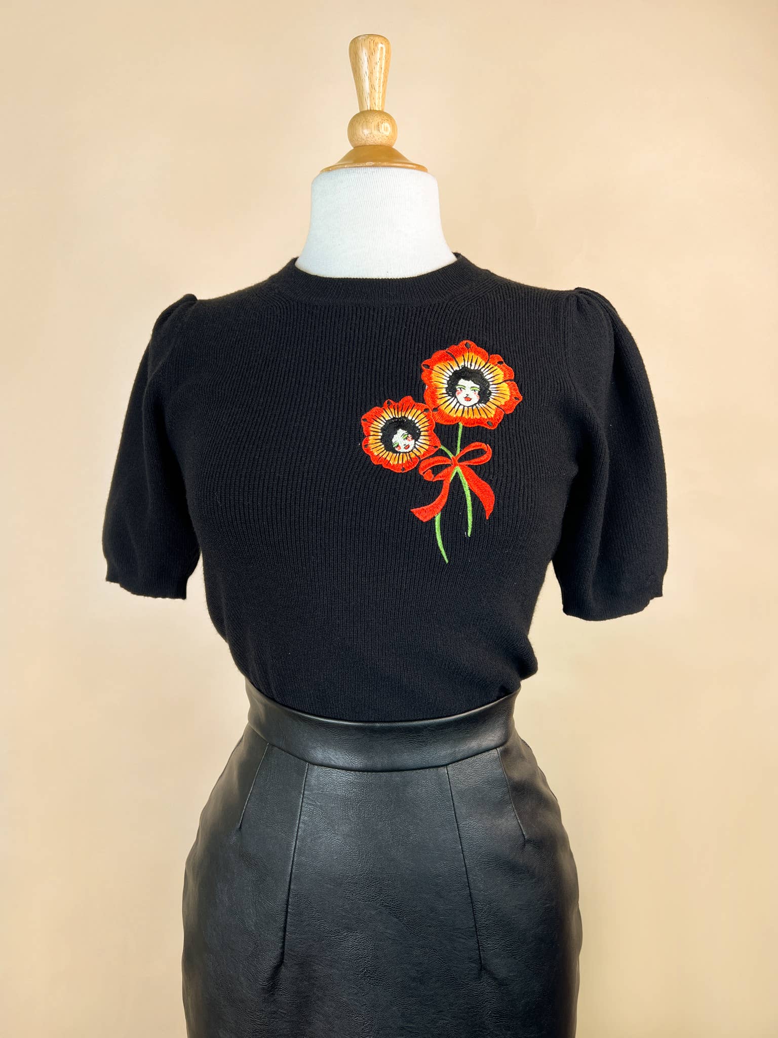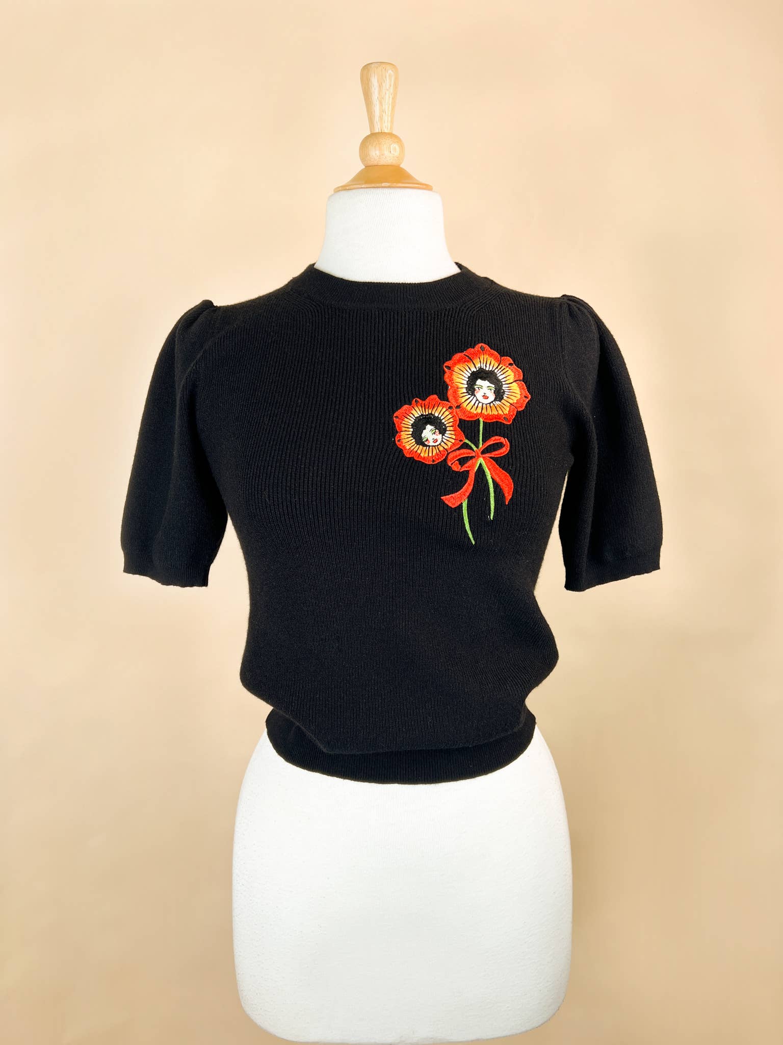Short sleeve sweater featuring flower sister embroidery art by Mischief Made.