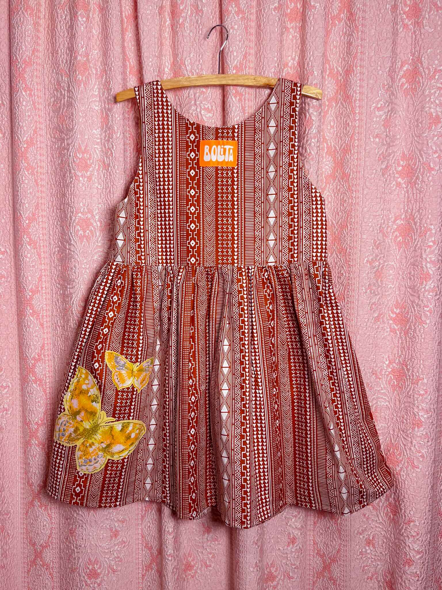 The Garden dress by Bolita is sleeveless with two large skirt pockets on the front. The Mariposa version is made from a rust-brown and white geometric cotton print and features decorative butterfly appliqués cut from vintage fabric on the front bodice and back skirt.