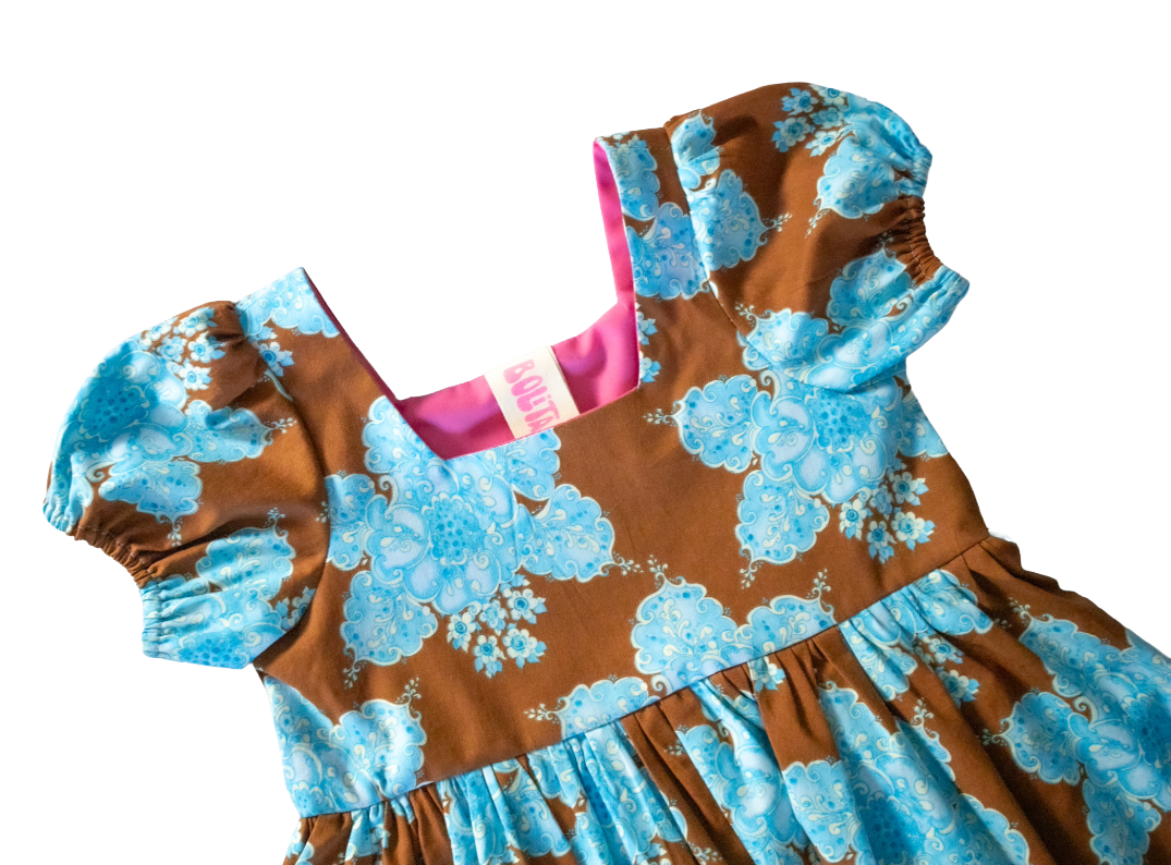The Sophia dress by Bolita Designs features a statement brown and blue floral vintage fabric, square neckline and puff sleeves. Designed for everyday wear or perhaps a tea party.