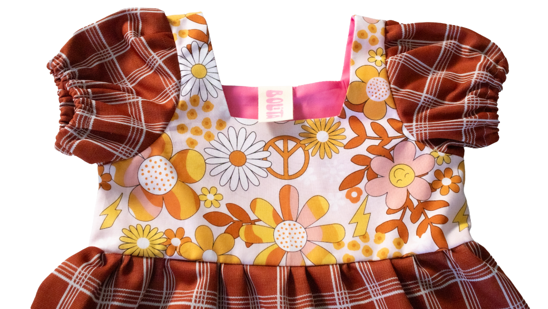 The Sophia Pattern-Play dress by Bolita Designs features a flower power print, brown vintage polyester plaid, a square neckline and puff sleeves. Made with boho and peaceful vibes.