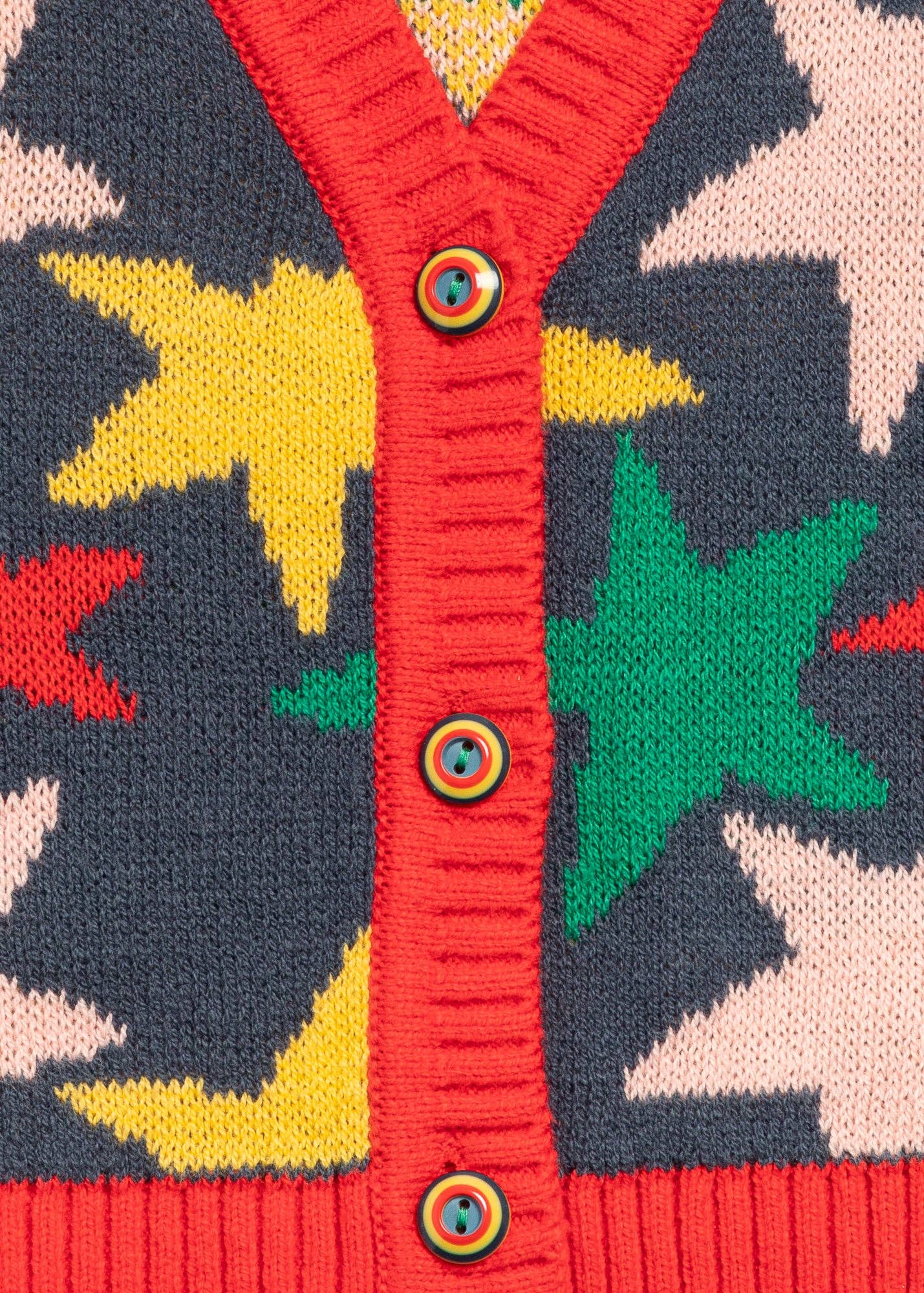 This intarsia knit design by Finding Foxtale features three-quarter length sleeves with a popcorn knit texture and custom multicolored buttons.