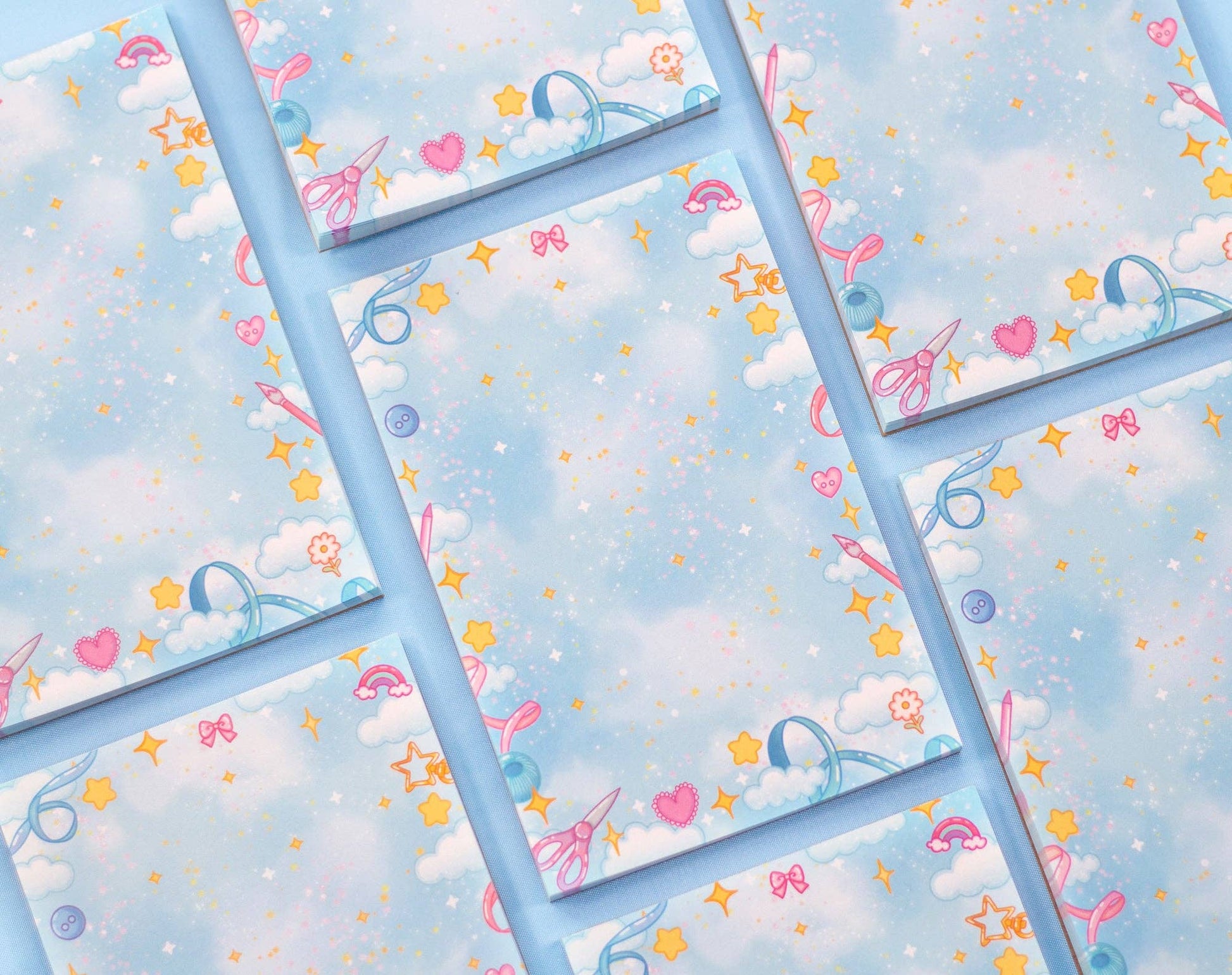 The sky is the limit with this notepad by Unicorn Eclipse featuring a stars and crafting supplies border with a cloud sky background.