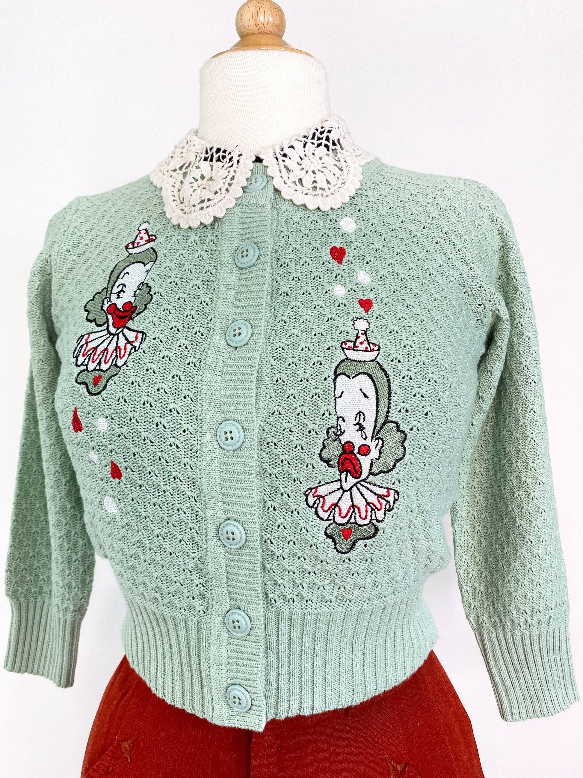 Clown embroidered cropped cardigan in mint by Mischief Made.