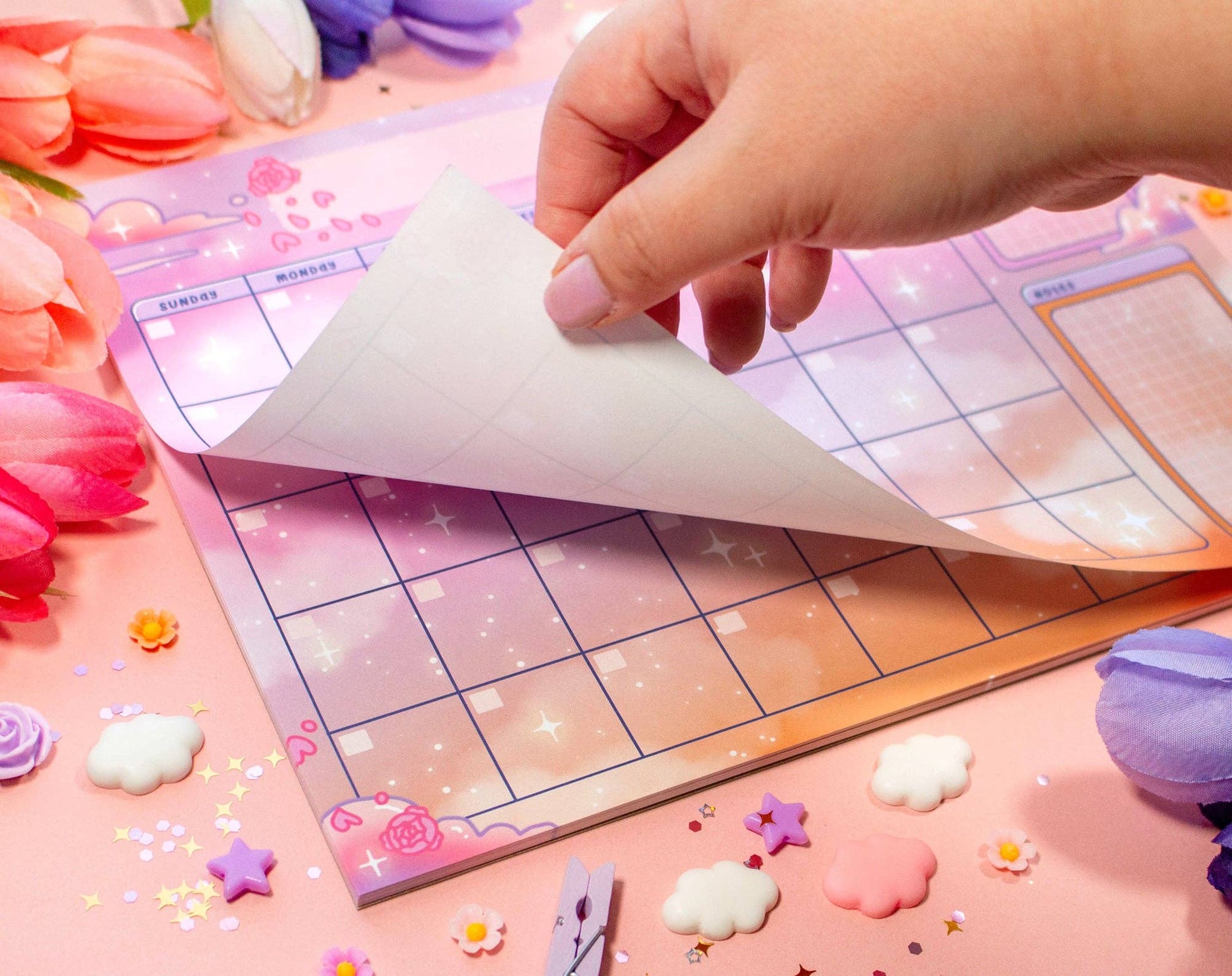 Monthly planner pad covered in pink and orange skies by Unicorn Eclipse.