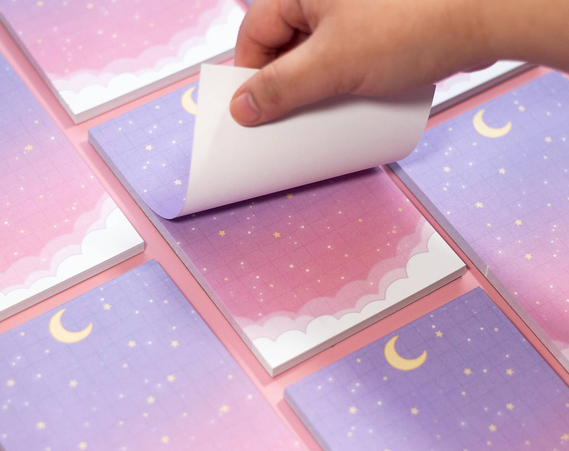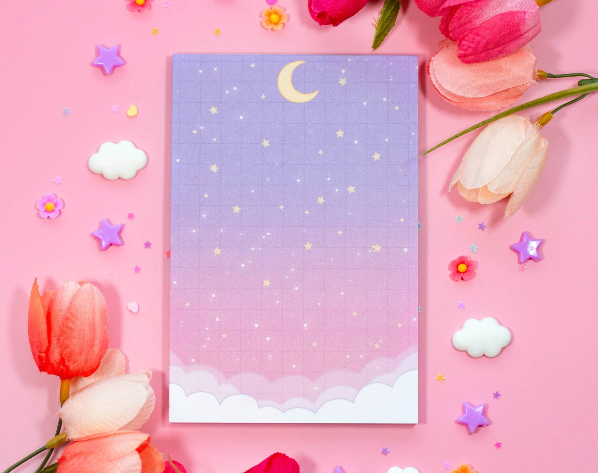 Starry Clouds notepad by Unicorn Eclipse featuring a soft grid night sky background with pink clouds and crescent moon.