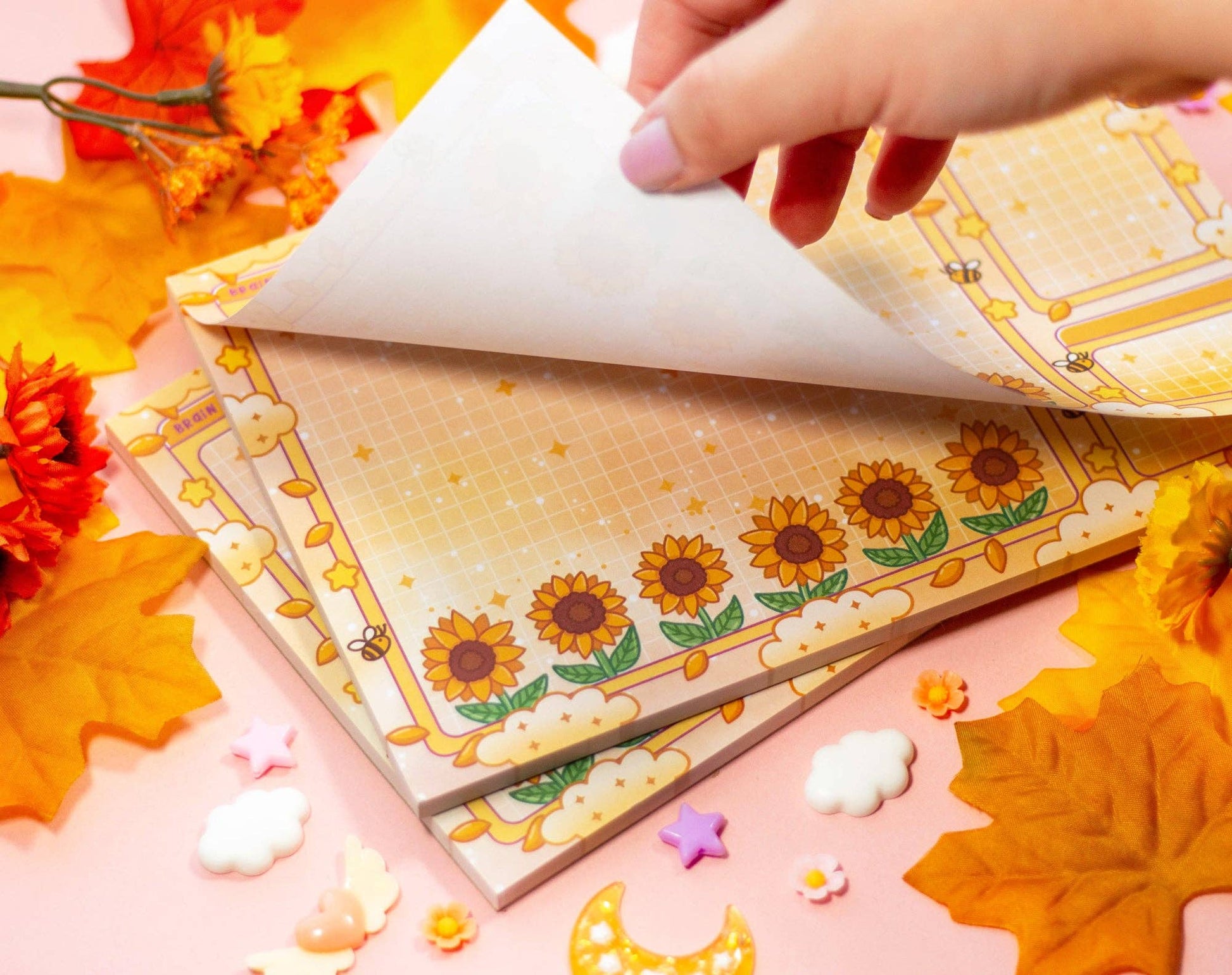 Cute planner pad for a brain dump featuring a golden grid background and sunflowers by Unicorn Eclipse.